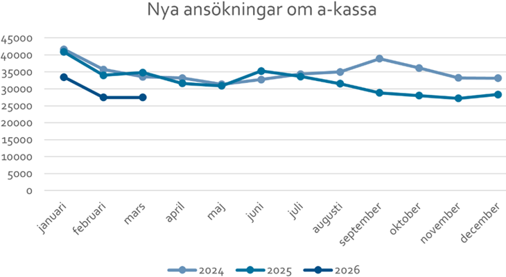 – Den nedgång i antal nya ansökningar som inleddes vid sommaren förra året stannar av i mars. Det kan röra sig om en påminnelse om att det fortfarande råder lågkonjunktur i Sverige. I början av året har också några större arbetsgivare meddelat förhållandevis omfattande varsel. Även om arbetslösheten minskar är den alltjämt hög, säger Johan Ahlgren, kommunikationschef i Sveriges a-kassor.